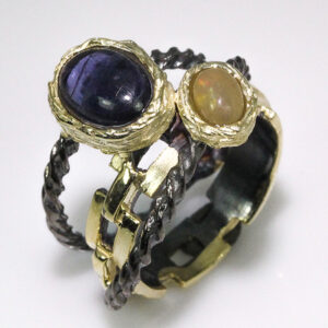 One-of-a-kind handcrafted 22K gold plated bangle features a mélange of authentic and faux gems, romantic filigree flourishes and exotic design. The bracelet has open filigree design, a rope detailed border, a hinged opening and closes securely with a screw.